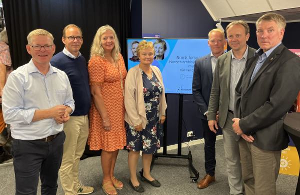 VIL HA FORLIK: - Vi vil ta initiativ til et bredt forlik på Stortinget om forsvarspolitikken. I framtida er det helt andre trusler som venter, og politisk forutsigbarhet vil være svært viktig, sier Arbeiderpartiets parlamentariske leder Rigmor Aasrud. På bildet ellers fra venstre er debattleder Jon Kristiansen (NHO), Fredrik Tangeraas (Nammo), Leif Haugland (Obsima Tech), Ola Gundersen (forsvarskoordinator Innlandet fylkeskommune,) Rigmor Aasrud (parlamentarisk leder Arbeiderpartiet), Ole Erik Hørstad (ordfører Åmot kommune, Høyre). Foto: Bjørn Jarle Røberg-Larsen
